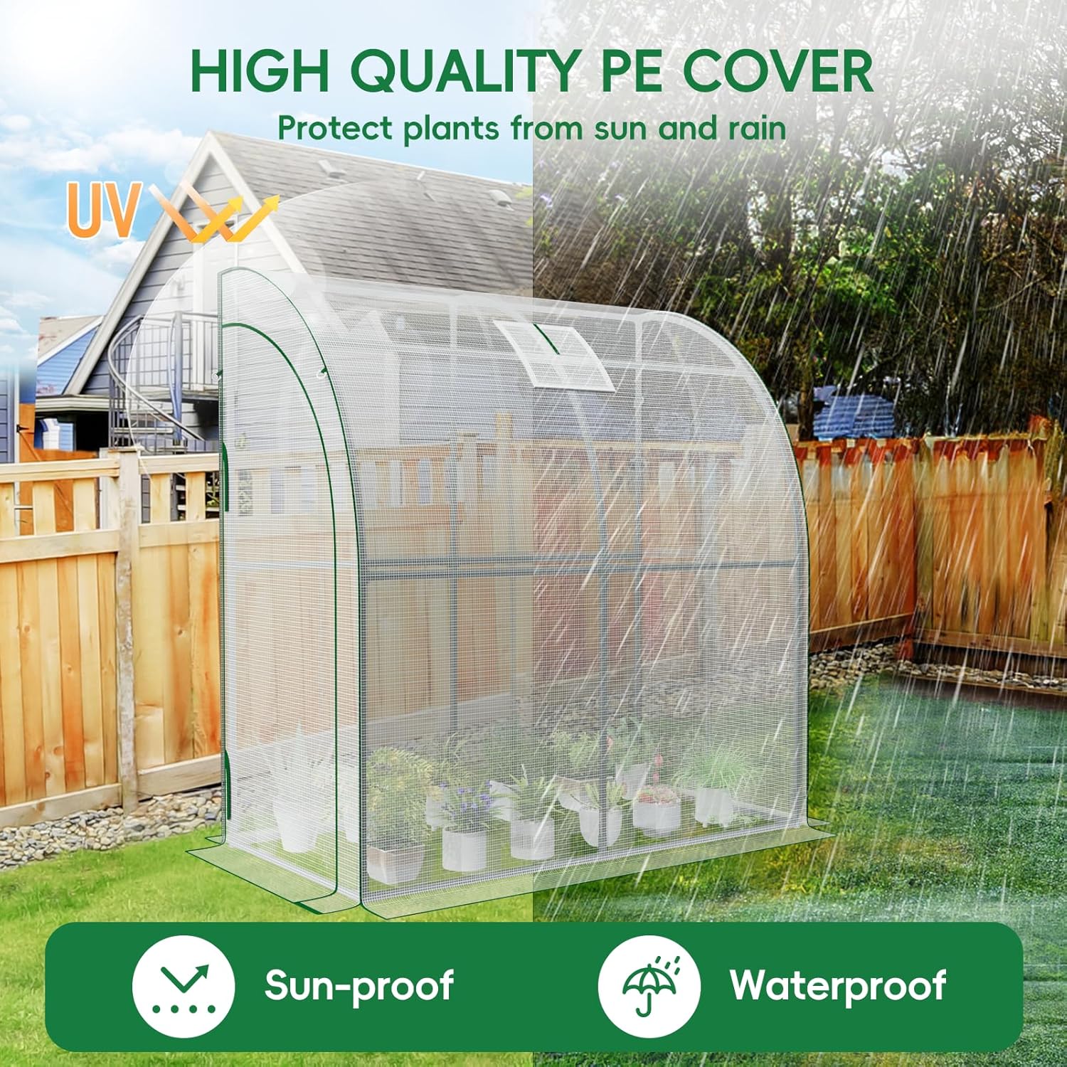 - Protective Polyethylene Cover: The SPECILITE greenhouse is equipped with a high quality thick PE cover which is UV and water resistant. It not only effectively protects the plants from outdoor elements, but also helps to keep them moisturized and insulated for better growth