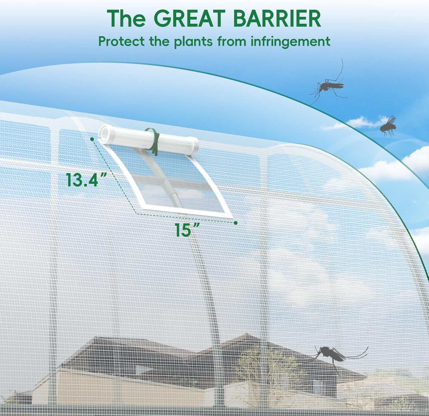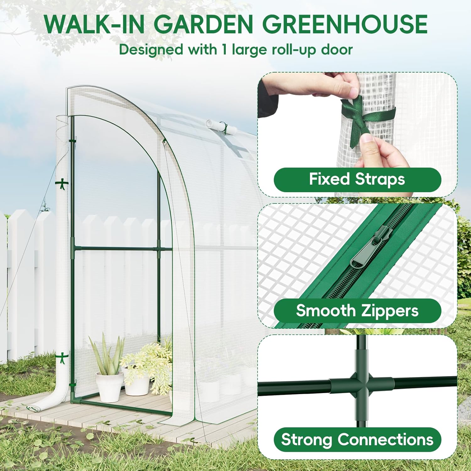 - Dual Zippered Door and Mesh Window: The walk-in greenhouse has a large roll-up zipper door on the left side for your easy access. The mesh windows provide partial air circulation and prevent small animals from entering. Open roller shutter door and window to ensure internal ventilation. Closing them helps to keep the greenhouse warm