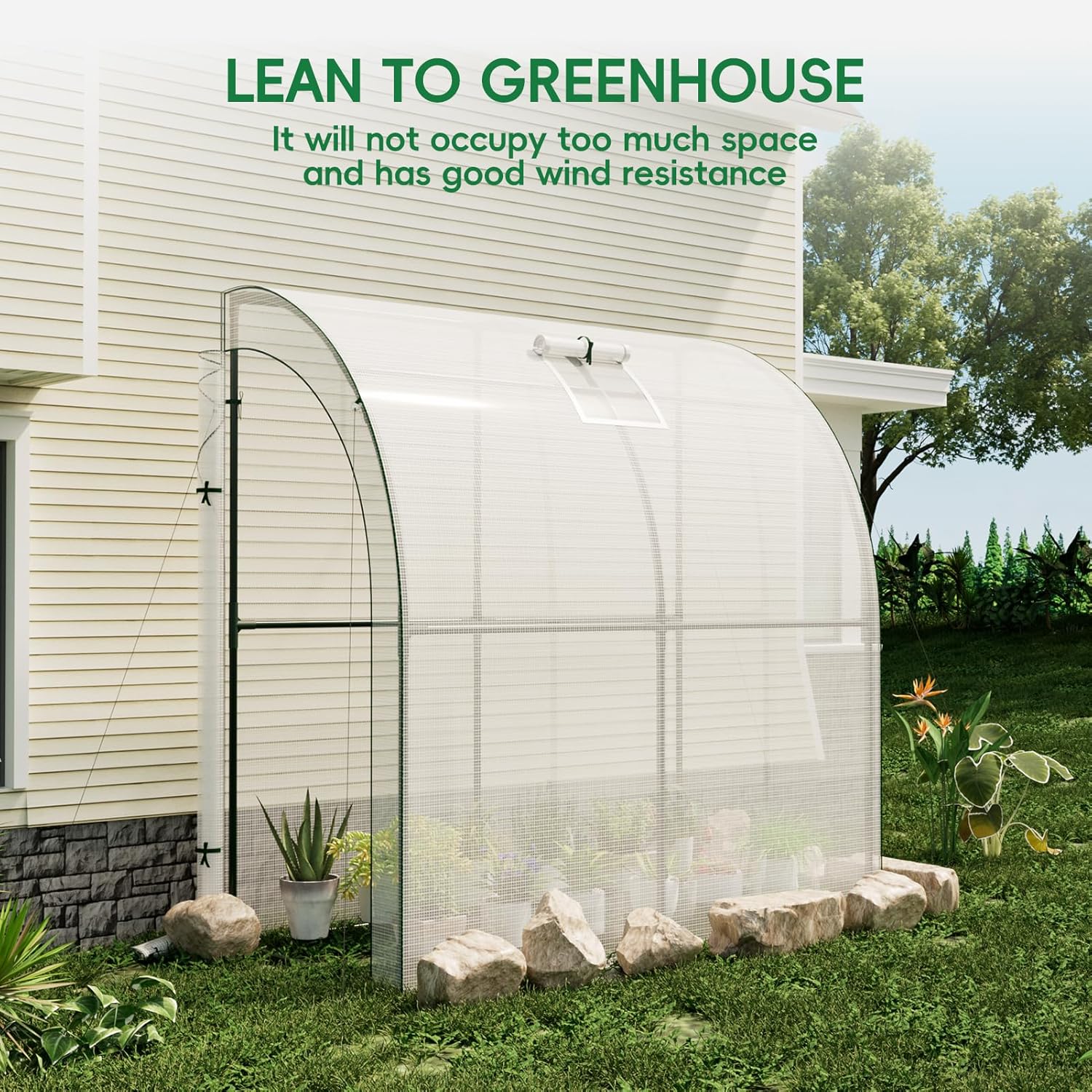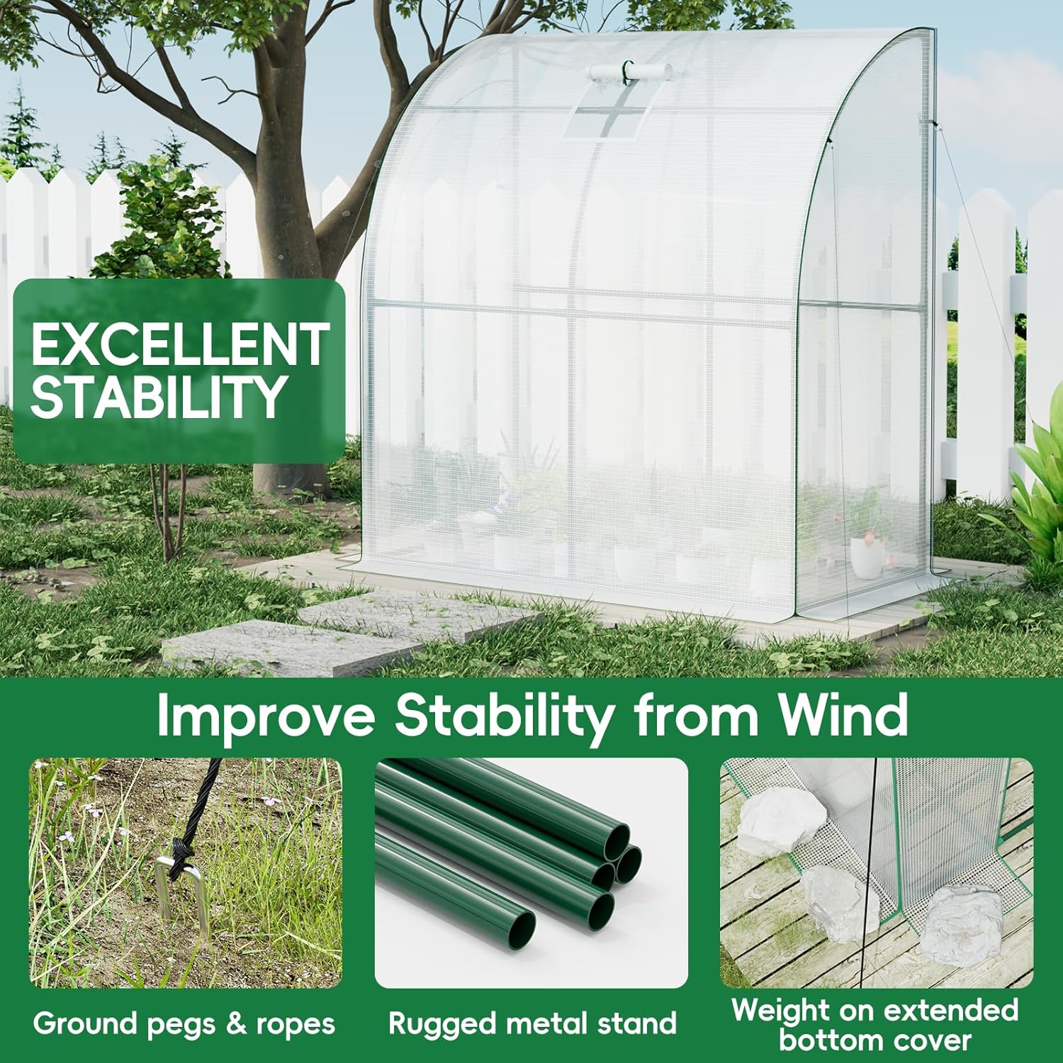 - Excellent Stability and Wind Resistance: The support frame is made of heavy-duty metal, providing strong support and ensuring stability. The flower house relies on the house for enhanced wind resistance. We also have extra-long covers for rocks, windbreak ropes, and metal stakes for securing them to the ground