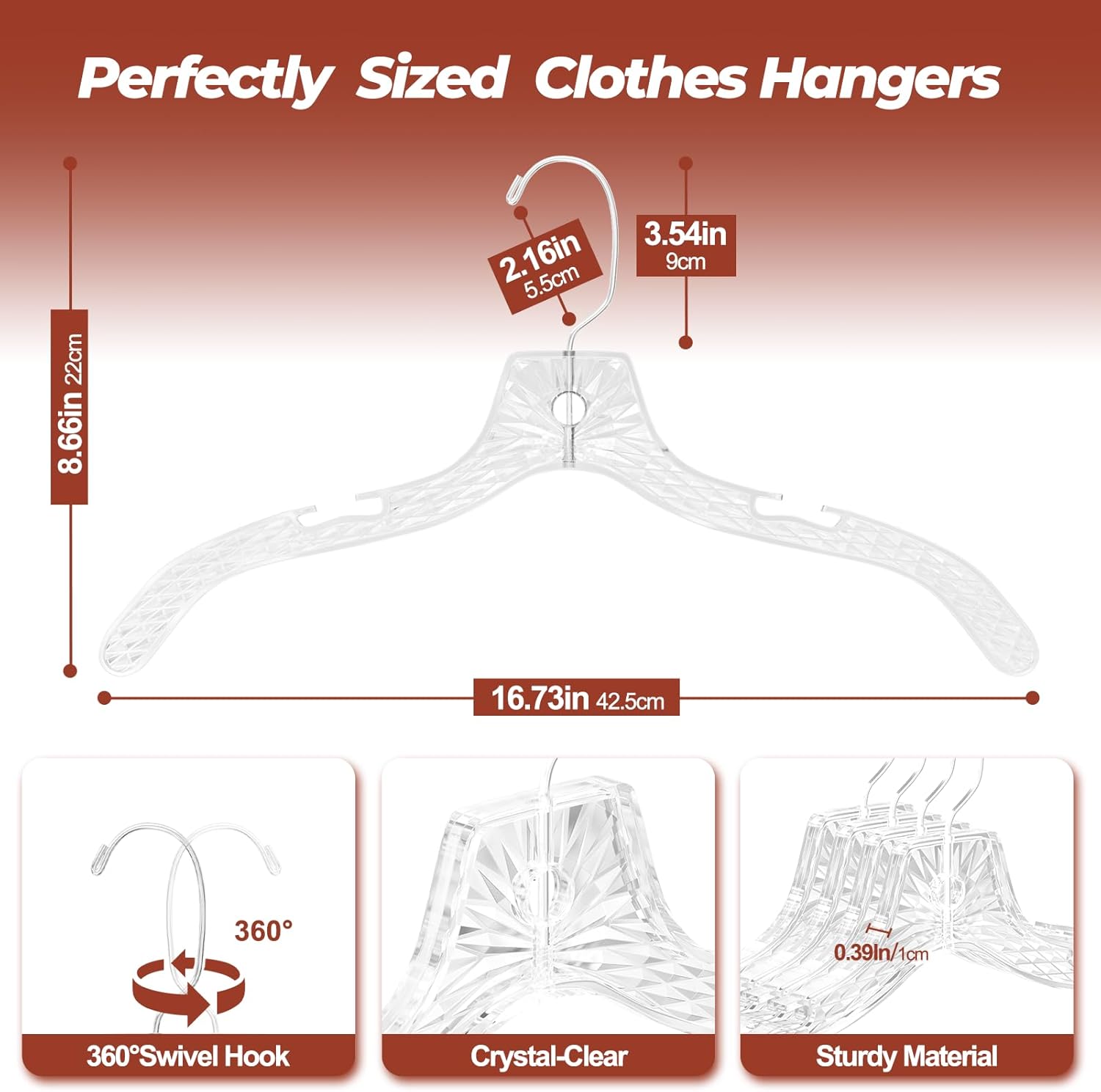 - Heavy Duty Hangers: Made from sturdy, clear plastic to withstand humid environments like bathrooms and laundry rooms, ensuring a longer lifespan than metal or wood hangers. Size: 16.73"W x 8.66”H x 0.39"T