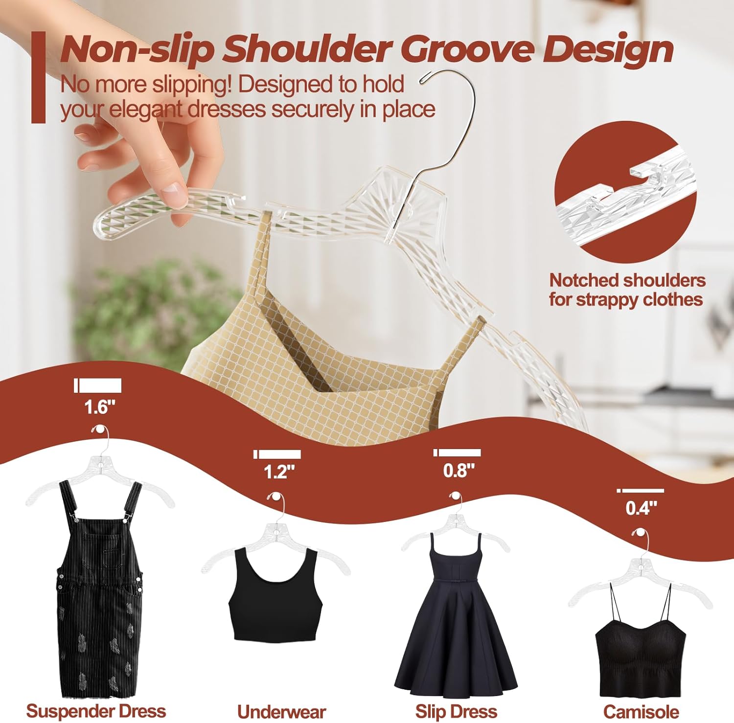 - Non-Slip Notched Design: No more slips! Whether it's delicate straps or smooth fabrics, our hangers keep them secure. The notched shoulders hold garments like camisoles and strap dresses in place, preventing them from slipping off