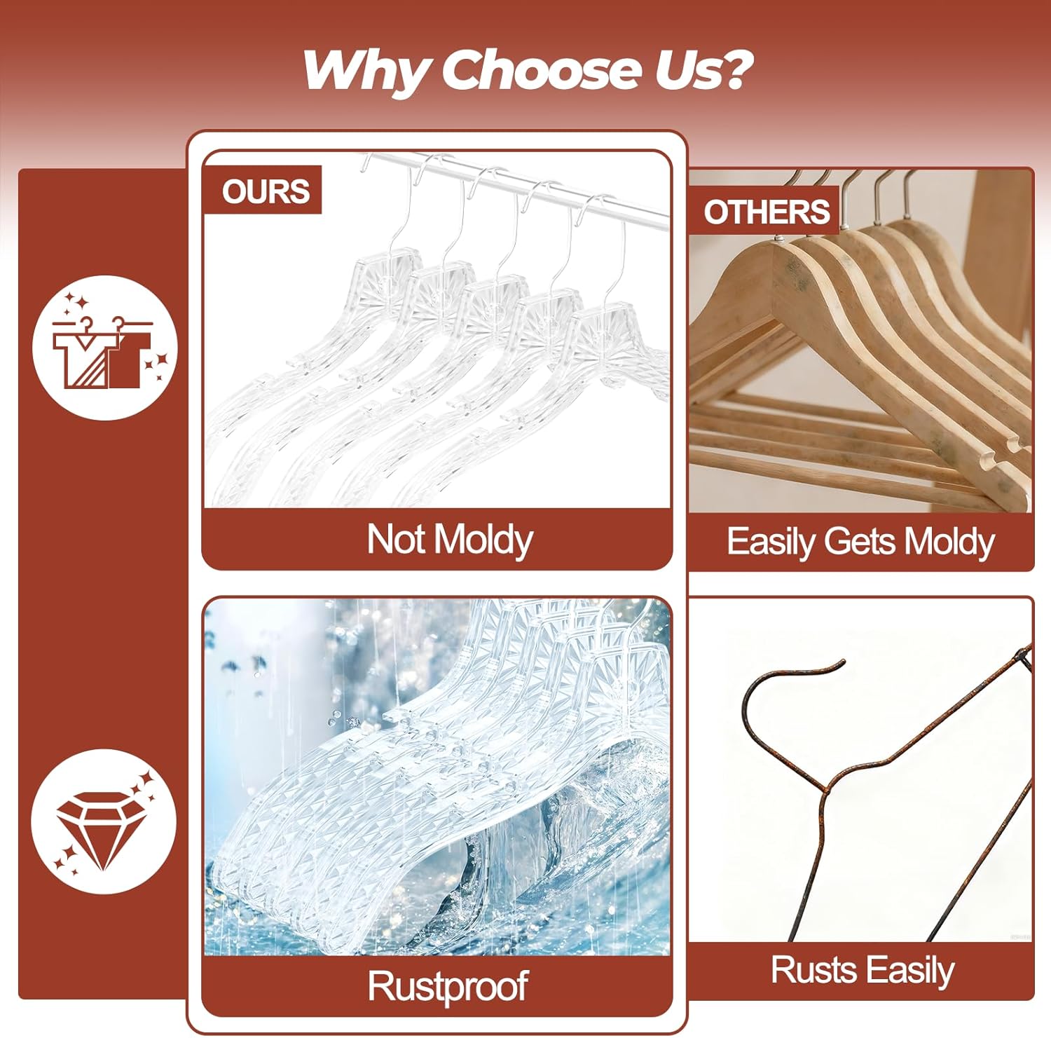 - Rust-proof & Wrinkle-Free: Our clear hangers are rustproof and resistant to bending. The ergonomic curved design securely supports heavy suits and coats for no stretching, no creasing, and no shoulder bumps, keeping your garments in perfect shape