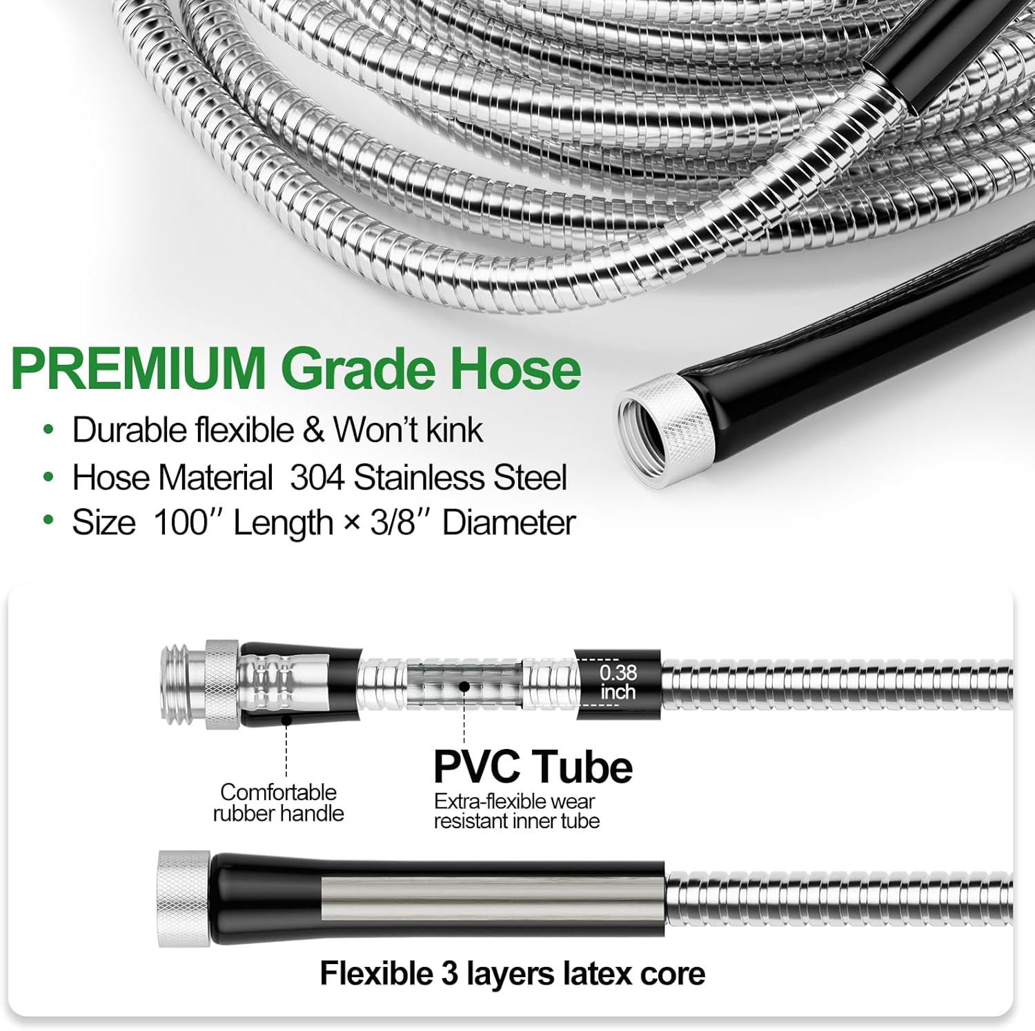 - 100-foot hose made of 304 stainless steel and a multi-layer flexible inner tube, with ends equipped with rubber gaskets to prevent leaks.