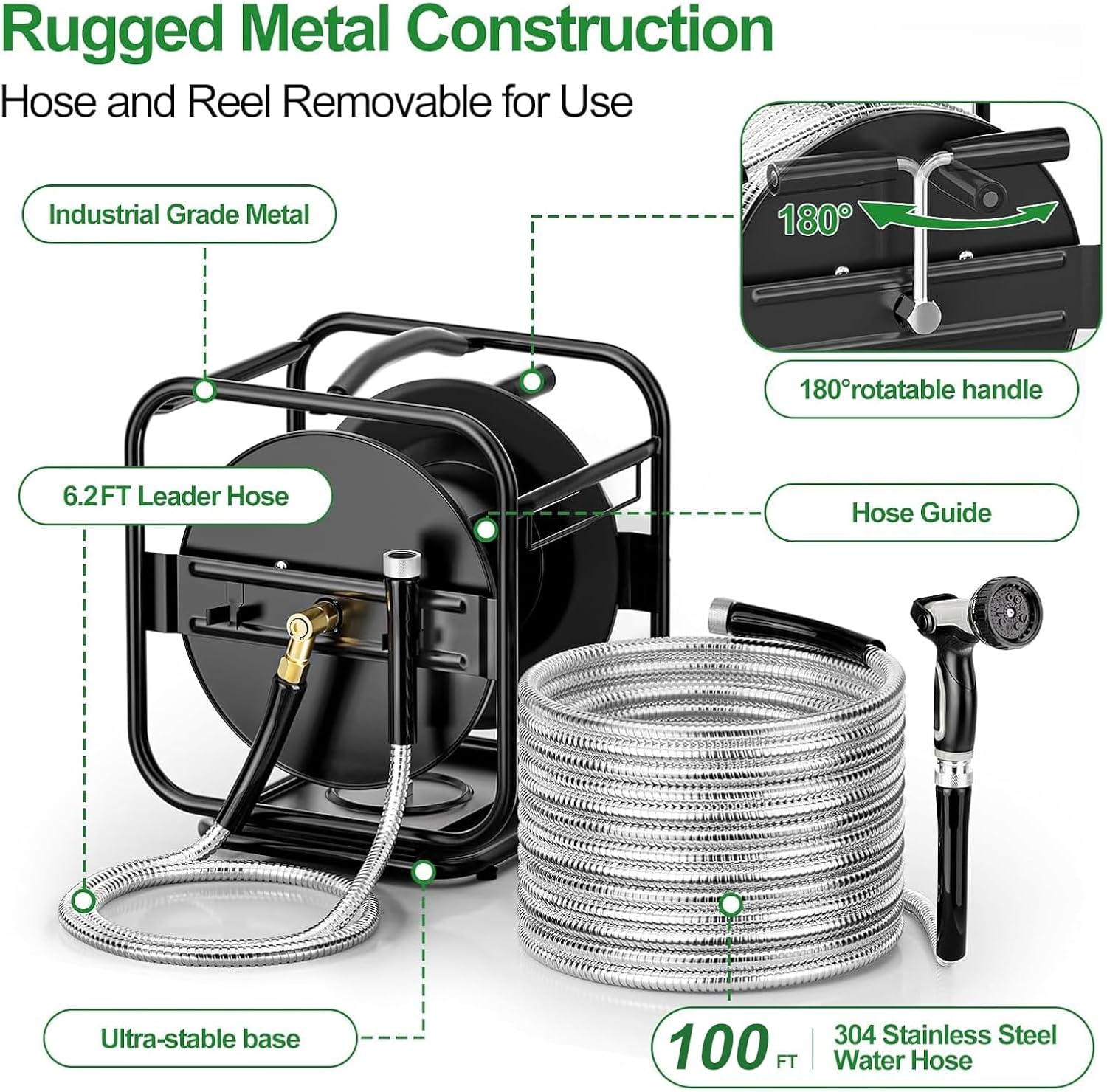 Metal Garden Hose Reel With 100 Ft 304 Stainless Steel Hose & Aluminum Nozzle, Wall Mount/Floor Spool