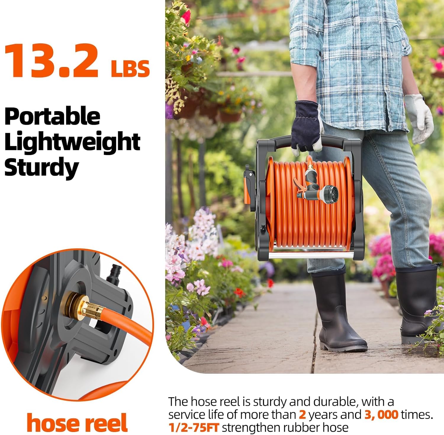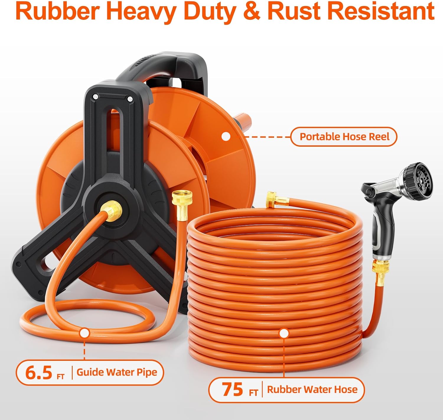 Portable Garden Hose Reel with 75Ft Rubber Water Hose & 6.5Ft Guide Water Pipe, Wall Mount/Floor Spool