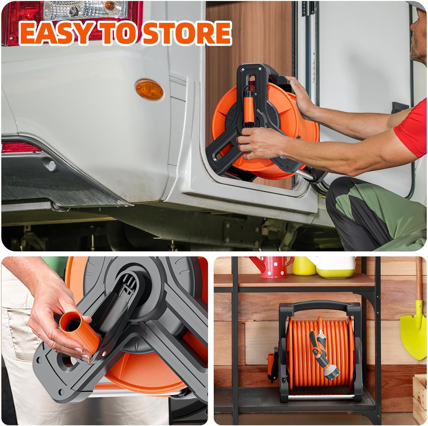 - ENJOY USING : Hose reel wall mount kit (Nozzle+Hose+Reel+et al.) has everything you need in one package. You can easily retrieve the hose without having to worry about it scattering outdoors