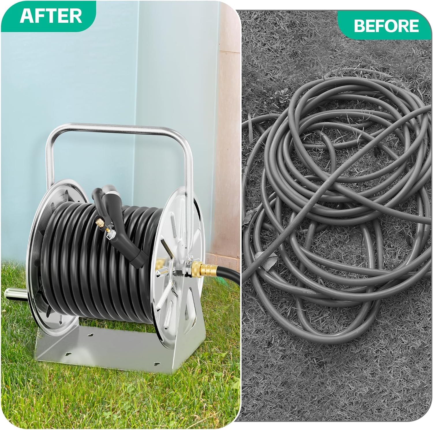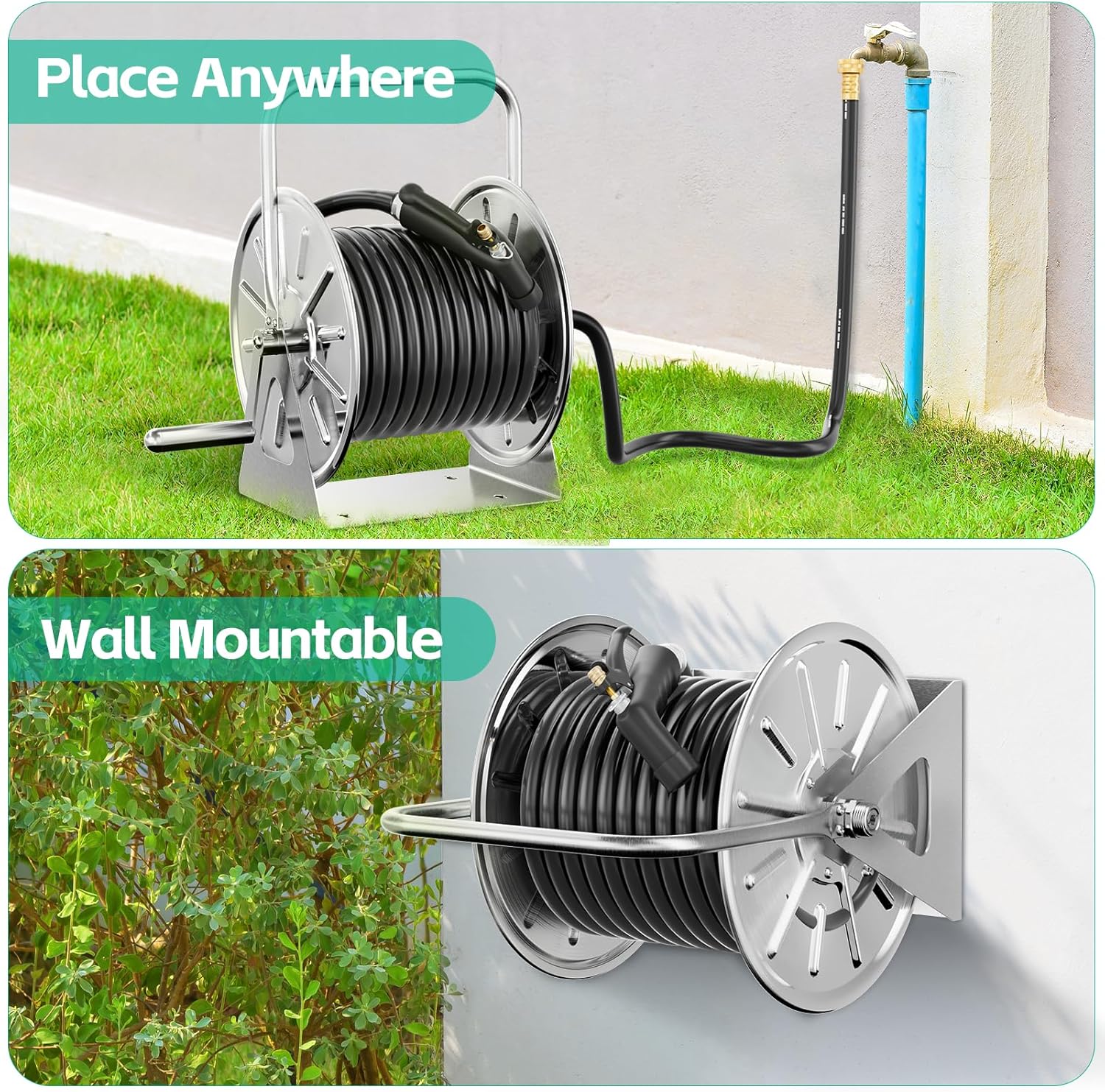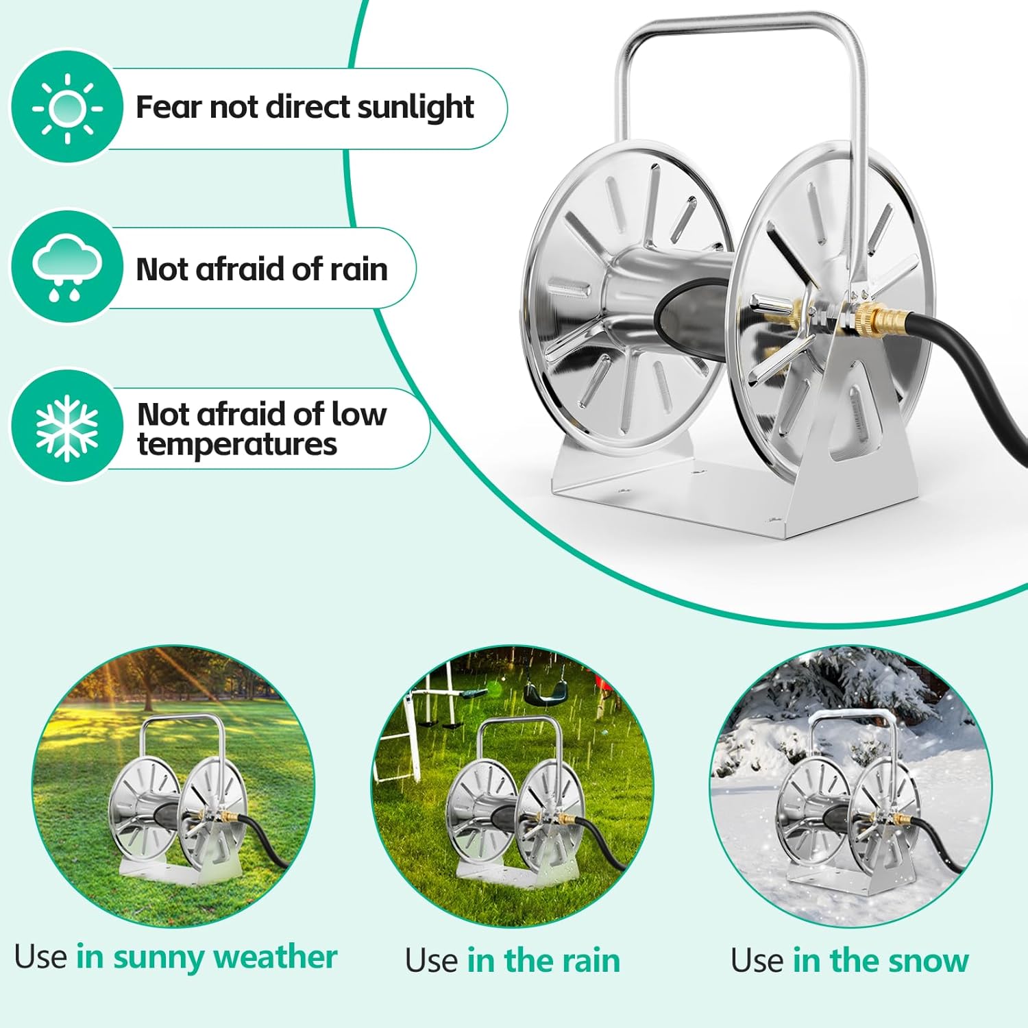 - DURABLE CONSTRUCTION : Industrial grade stainless steel makes the hose reel stronger and more durable, corrosion and impact resistant for all-weather use , and the solid brass connector is leak proof and wear resistant for long life
