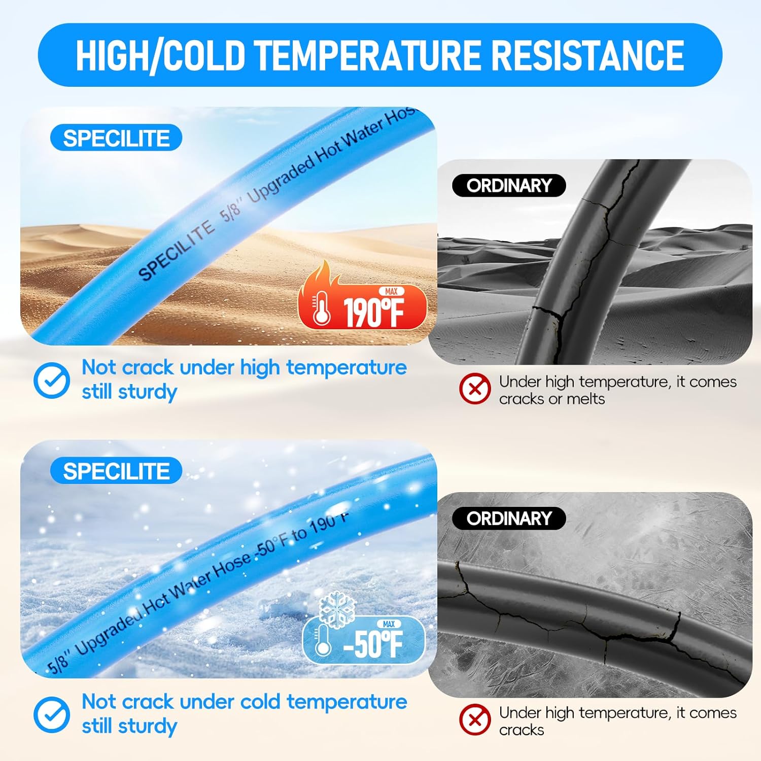 - HIGH TEMPERATURE RESISTANCE : The hot water hose can withstand temperatures up to 190 °F. The hoses will not soften or crack when exposed to summer sunlight or high temperatures. They can also be used for hot water washing or draining water heater sediment